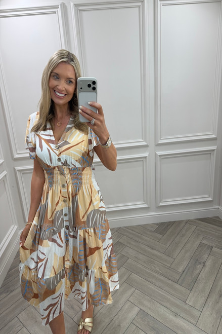 Beige Willow Floral Shirred Midi Dress