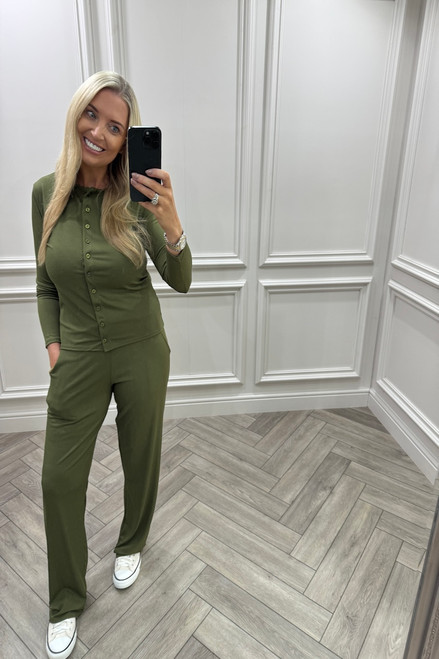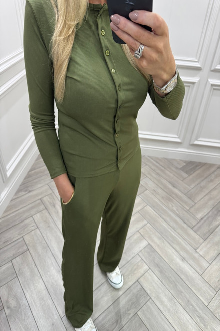 Khaki Lorenza Ribbed Button Up Lounge Set