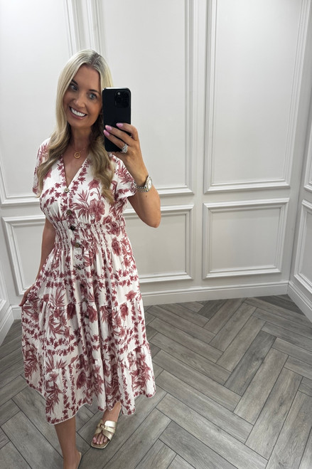Odette Red Shirred Midi Dress