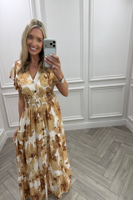 Tan Poppy Shirred Maxi Dress